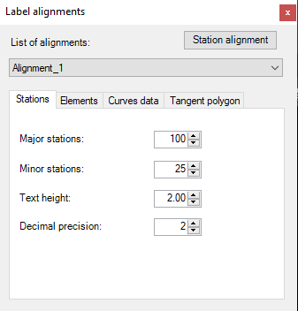 Stacioniranje osovine Korak stacionaža koje se ispisuju kao posebne Visina teksta Visina teksta Decimalna preciznost |
