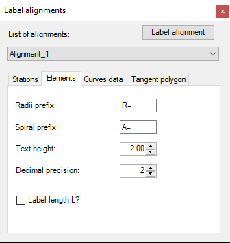 Obeležavanje elemenata osovine Prefiks za obeležavanje vrednosti radijusa Prefiks za obeležavanje vredosti prelaznice Visina teksta Decimalna preciznost Ukoliko se štiklira upit Label length L? - komanda će podrazumevati da je potrebno obeležavati dužinu prelaznice |