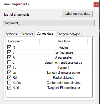 Ispisivanje numeričkih podataka o krivinama U levoj koloni se nalaze ispisani prefiksi za podatke koji mogu biti ispisani u zavisnosti od toga da li je štiklirana kućica isred ili ne. Jednim klikom na prefiks u listi moguće ga je i promeniti. U drugoj koloni se nalazi kratki opis podataka |