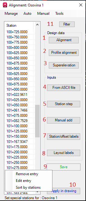 Nakon pokretanja komande otvara se dijalog prozor u kome postoje brojne opcije za rad sa specijalnim stacionažama. 1. Dodavanje stacionaža ključnih tačaka osovine u situacionom planu 2. Dodavanje stacionaža ključnih tačaka nivelete 3. Dodavanje stacionaža ključnih tačaka sheme vitoperenja 4. Dodavanje stacionaža iz spoljnog ASCII fajla (*.SEC ili *.STA fajl 5. Dodavanje stacionaža sa pravilnim korakom čija se vrednost unosi u komandnoj liniji nakon odabira opcije 6. Ručno dodavanje stacionaža koje se interaktivno preuzimaju na osnovu odabira tačke u situacionom planu 7. Dodavanje stacionaža iz odabranih postojećih Station/Offset markera u situacionom planu 8. Dodavanje stacionaža iz odabranih postojećih blokova za obeležavanje pojava u situacionom planu 9. Opcija kojom se spisak stacionaža u dijalog prozoru čuva kao podatak o setu stacionaža unutar crteža 10. Iscrtavanje svih stacionaža sa spiska u crtežu 11. Filtracija stacionaža na osnovu kriterijuma dve susedne stacionaže U meniju Manage postoji i dodatna opcija "Open" kojom se može učitati već postojeći set stacionaža u crtežu, i onda direktno u njemu vršiti izmene Klikom na neku od stacionaža sa spiska u dijalog prozoru, otvara se mali kontekstualni meni sa opcijom za uklanjanje stacionaže, izmene stacionaže i sortiranjem spiska stacionaža