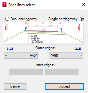 Moguće je podesiti ivične linije za profil puta sa jednom ili dve kolovozne trake. Prilikom odabira Dual carriageway potrebno je odabrati prethodno konstruisane i povezane dve spoljne i dve unutrašnje ivice, dok je kod odabira Single carriageway dovoljno odabrati dve spoljne ivične linije. U dijalog prozoru, ponudjene su ivicne linije definisane programom, sa ispisom odmaka od osovine plavom bojom (npr. -3.25 za levu ivicu odnosno grupu A45, i 3.25 za desnu ivicu odnosno grupu A68). Naravno, dijalog je moguce i zatvoriti opcijom Cancel, pri cemu onda korisnik unosi fiksne vrednosti levog i desnog odmaka spoljne ivice od osovine, kroz upite u komandnoj liniji.