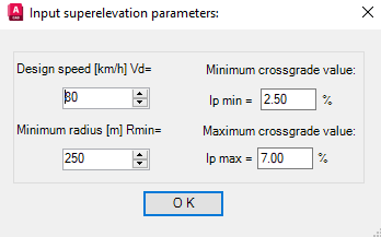 potom se otvara dijalog prozor za odabir merodavne računske brzine i minimalnih radijusa krivine, kao i minimalnog i maksimalnog poprečnog nagiba
