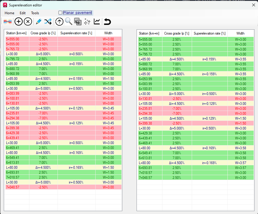Ovako prikazan predlog sheme vitoperenja odnosi se na profil sa profil sa jednostranim nagibom bez razdelnog ostrva, ali je moguće prikazati i shemu za profil sa odvojenim kolovozima ili eventualno profil sa krovastim nagibom. Ukoliko se radi o prafilu sa nagibom sa razdelinim pojasom ili krovastim nagibom, potrebno je odštiklirati opciju Planar pavement. U takvom prikazu leva tabela se odnosi na levu polovinu profila, a desna na desnu polovinu profila.