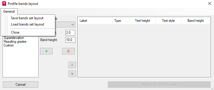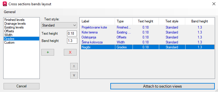 XSECBANDS komanda pokreće dijalog prozor sa podešavanjima izgleda traka odnosno rubrika za ispis elemanata za obeležavanje profila.