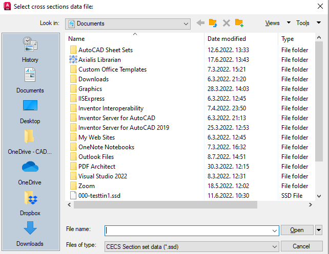 XSECDRAW komanda pokreće konstrukciju poprečnih profila iz odabranog spoljnog *.SSD fajla, i uz odabrane parametre kroy dijalog prozor sa inicijalnim postavkama.