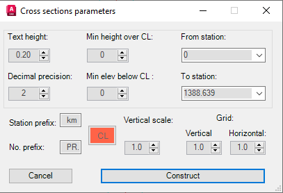izgleda poprečnih profila: Text height - odredite visinu teksta ispisa u poprečnim profilima Decimal precision - odredite broj decimala u prikazu Min height over CL - postaviti minimalnu visinu iznad kote nivelete u profilu Min height below CL - postaviti minimalnu visinu ispod kote nivelete u profilu From station - postavite stacionažu početnog profila za konstrukciju To station - postavite stacionažu krajnjeg profila za konstrukciju Station prefix - prefiks ispisa stacionaže No. prefix - prefiks ispisa broja profila CL - dugme za postavljanje boje centralne linije (osovine) poprečnog profila Vertical scale - odnos vertikalne prema horizontalnoj razmeri Grid Vertical - korak iscrtavanja vertikalnog rastera u profilu Grid Horizontal - korak iscrtavanja horizontalnog rastera u profilu |