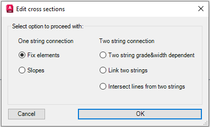poprečnim profilima Sa leve strane nalaze se dve opcije pri kojima se radi o konstrukciji koja je vezana za jednu tačku stringa u profilu, sa desne strane su tri opcije za konstrukciju ze koje se koriste po dve tačke stringa u profilu. Fix elements - kačenje fiksnih elemenata (linija) za odabranu tačku STRINGa Slopes - kačenje linija kosina do ciljane površi prema zadatim parametrima orijentacije i FIL-CUT fajla, za odabranu tačku STRINGa Two strings grade&width dependents - kačenje elemenata (linija) za odabrani par tačaka STRINGa (prikladno za slojeve kolovoza) Link two strings - povezivanje odabranih tačaka STRINGa Intersect lines from two strings - presecanje linija puštenih iz dve tačke STRINGa |