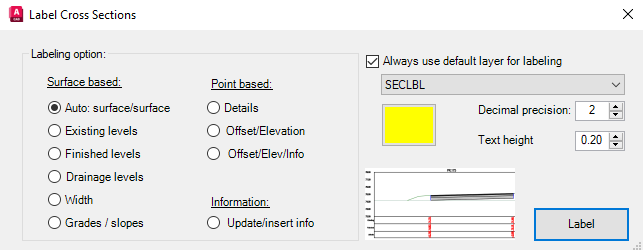 XSECLABEL komanda pokreće dijalog prozor sa izborom tipa željenog obeležavanja, kao i podešavanjima formata obeležavanja.