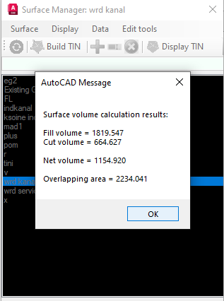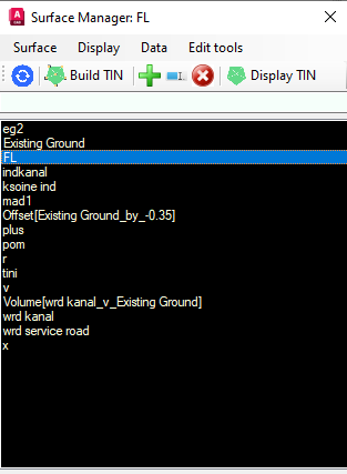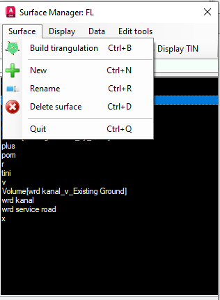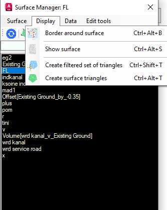 Osim pomenutih alata iz trake, koje se mogu naći i u podmeniju Surface, u podmeniju Display ponuđene su i mogučćnosti Border around surface - iscrtavanja 3d polilinije oko površi, Show surface - trenutni prikaz triangulacije površi Create filtered set of triangles - konstrukcija dela odabrane površi uz kriterijum min i max visinske kote Create surface triangles - kontrukcija svih trougličća odabrane površi