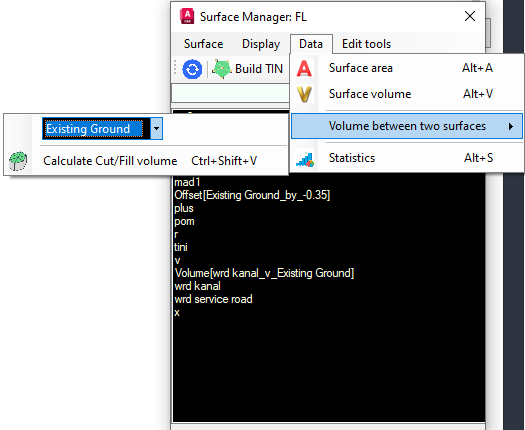 Podmeni Data Surface area - prikaz površine površi, zakrivljene i horizontalne projekcije Surface volume - prikaz zapremine površi u odnosu na 0 ravan Volume between two surfaces - odabir sa kojom površi se upoređuje odabrana površ (zahvaćena zapremina), program generiše površ i daje mu automatski naziv Statistics- statističŤki podaci za odabranu površ |