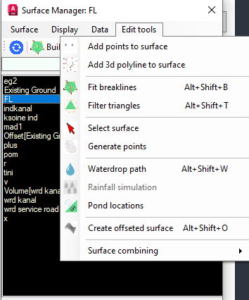 Podmeni Edit tools Add points to surface - dodavanje tačŤaka u postojeću površ Add 3d polyline to surface - dodavanje 3d polilinijau postojeću površ Fit breaklines - uklapanje brejklinija u postojeću površ Filter triangles - filtriranje trouglića odabrane površi po kriterijumu max dužine izvodnice Select surface - odabiranje grupe trouglova - površi u crtežu Generate points - kreiranje tačŤaka koje čŤine odabranu površ Waterdrop path - analiza putanje kapi vode na odabranoj površi Rainfall simulation - simulacija kiše na odabranoj površi (komanda još u razvoju!) Pond locations - prepoznavanje lokalnih konkaviteta (mesta barica) na odabranoj površi Create offseted surface - kontrukcija povši na vertikalnom rastojanju od odabrane površi, program generiše površ i daje mu automatski naziv Surface combining - funkcija trenutno u razvoju |
